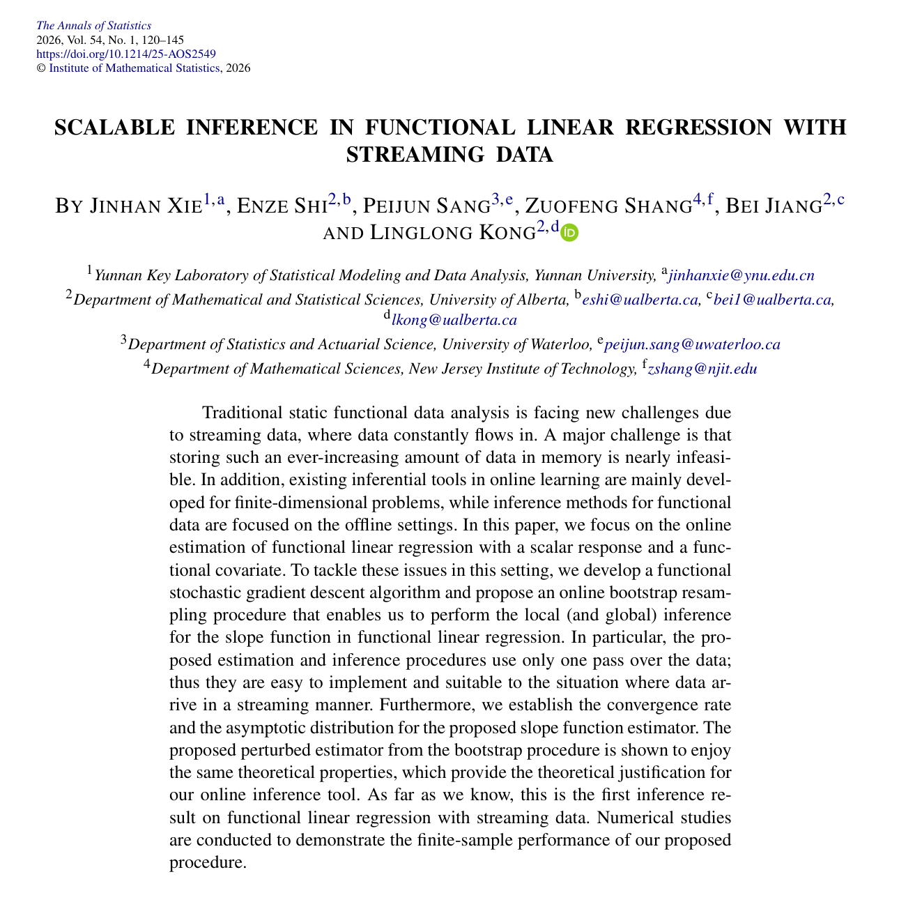 近日,云南大学数学与统计学院谢锦瀚副教授及其合作者在统计学国际顶级期刊 The Annals of Statistics (统计年鉴)上发表题为 “Scalable Inference in Functional Linear Regression with Streaming Data” 的研究论文。