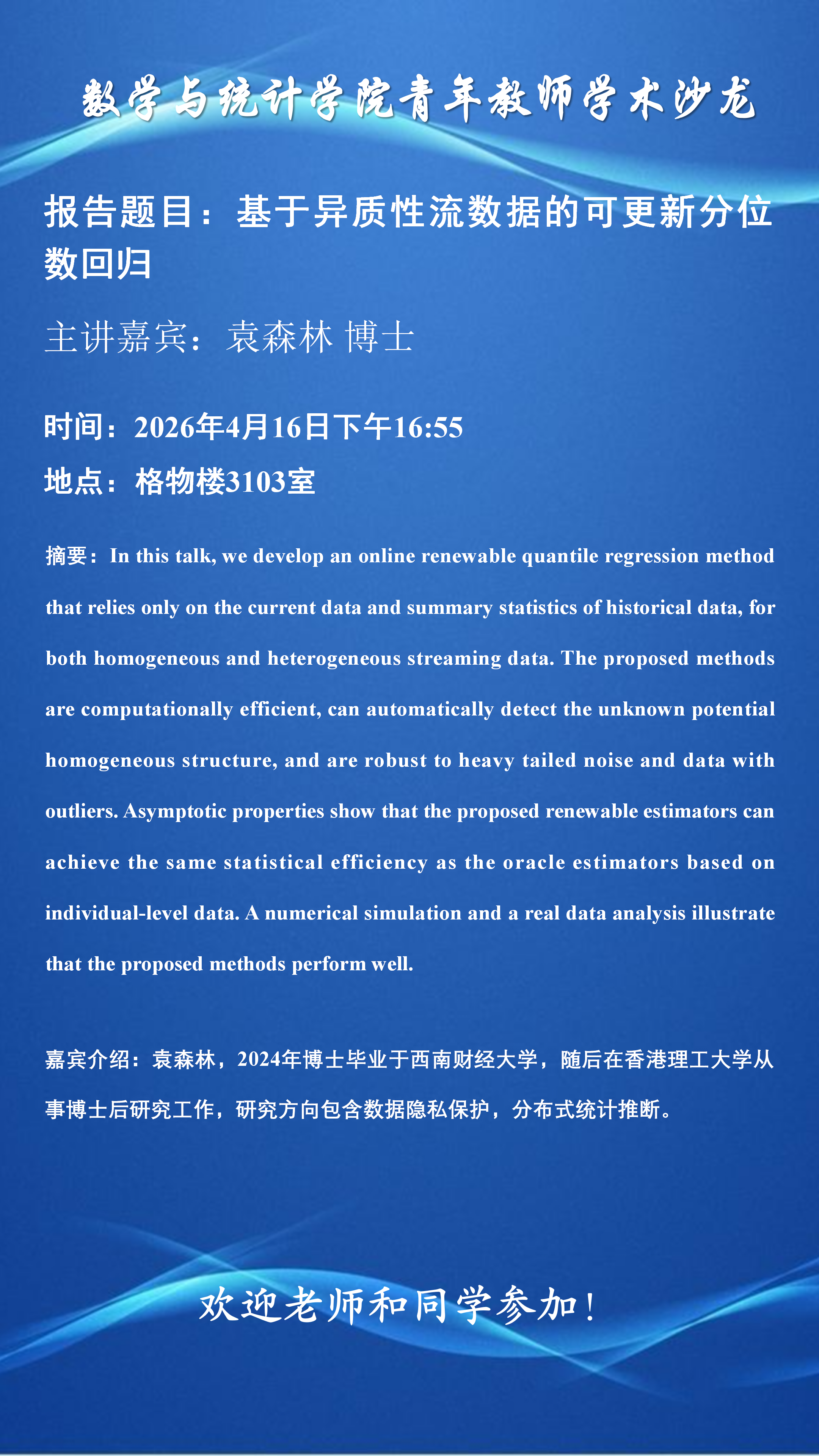 青年教师学术沙龙丨袁森林 博士:基于异质性流数据的可更新分位数回归